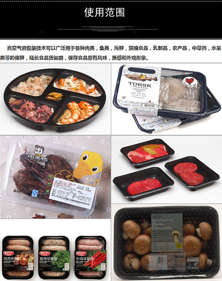 真空氣調包裝技術可以廣泛應用于各種肉類,魚類,海鮮,烘焙食品,乳制品,農產品,中草藥,水果類等的保鮮,延長食品貨架期